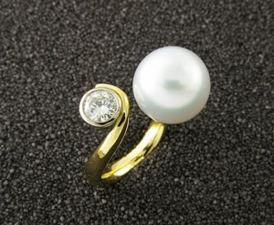 Damenring in Weiss- & Gelbgold 750, Südseeperle naturfarben, Lüster fein, 12,5 mm und Kundenbrillant
